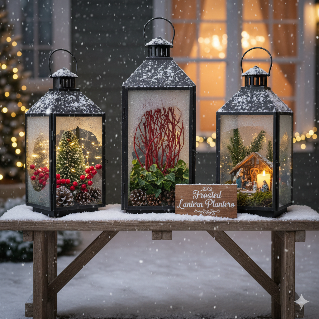 Use vintage lanterns as mini planters. Add soil and plant small succulents or moss. Finish with faux snow spray for a frosted effect.