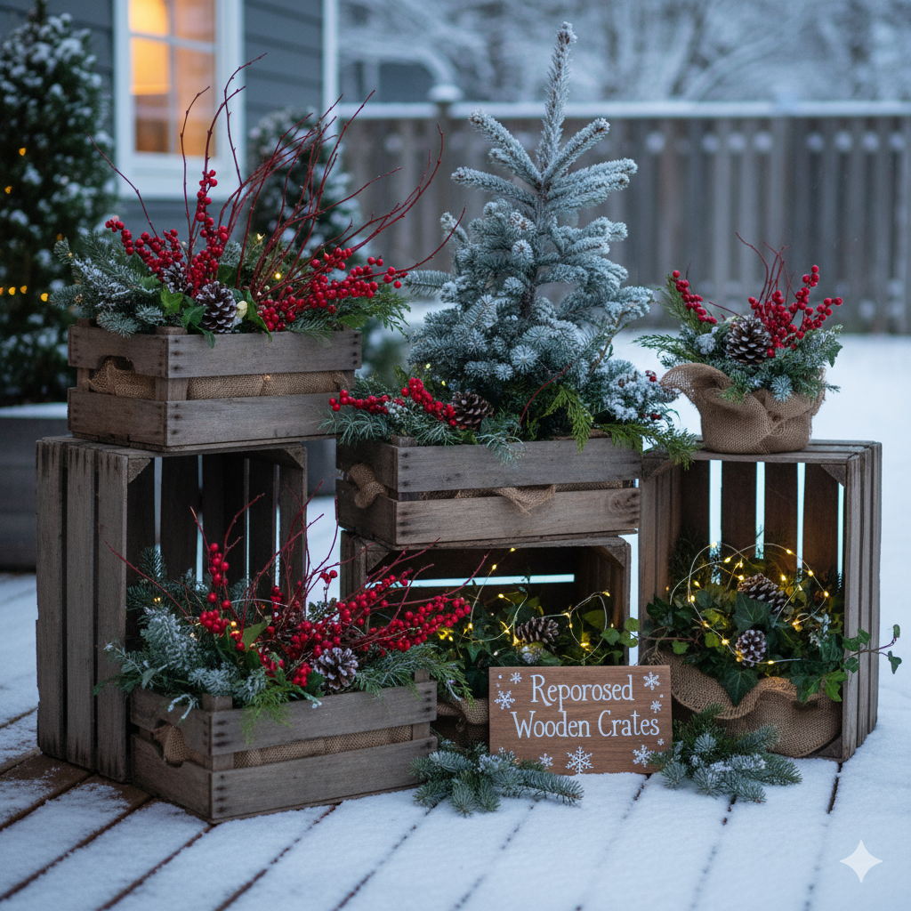 Turn an old wooden crate into a rustic winter planter. Line it with burlap, fill it with soil, and plant hardy winter greens like kale or ornamental cabbage.