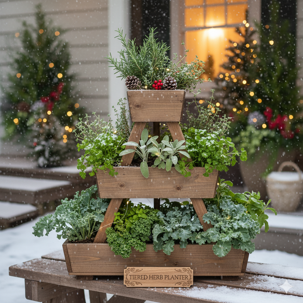 Stack several pots of descending sizes. Plant winter herbs like rosemary, sage, and parsley in each tier. This is great for small spaces and adds greenery to your porch.