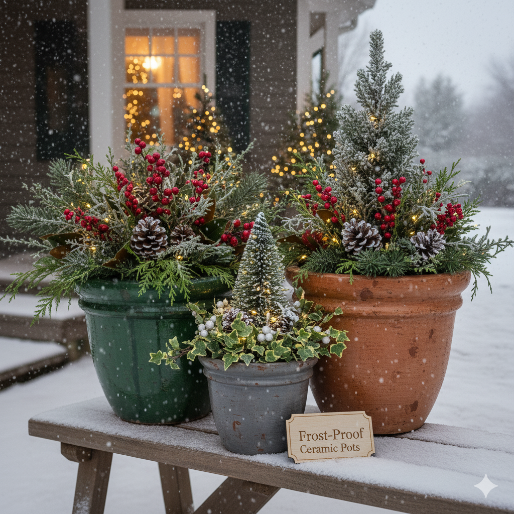 Pick colorful, frost-resistant ceramic pots. Fill them with hardy perennials like heather or dwarf conifers. The vibrant pots add a cheerful touch to dreary winter days.