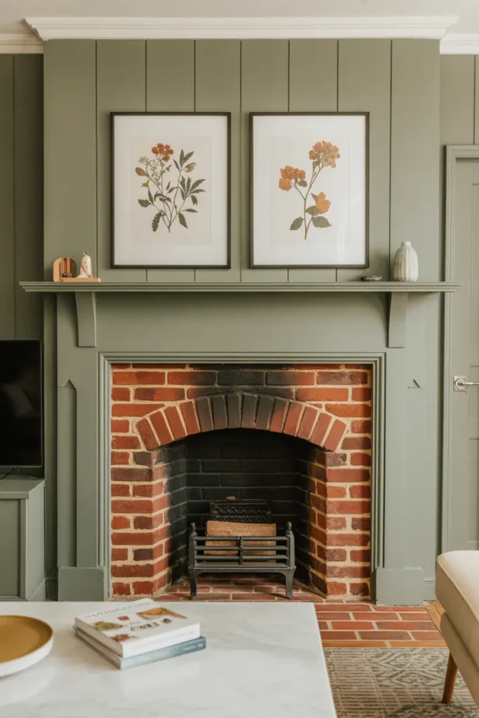 This brick fireplace painted with muted sage woodwork exudes warmth and grounded comfort. The botanical pressed-paper art above the mantel brings Victorian sensibility with a modern black-frame update. Even as a non-functional decorative element, this fireplace adds architectural character to any room. Paired with marble accents, it achieves a subtle mid-century contemporary twist.