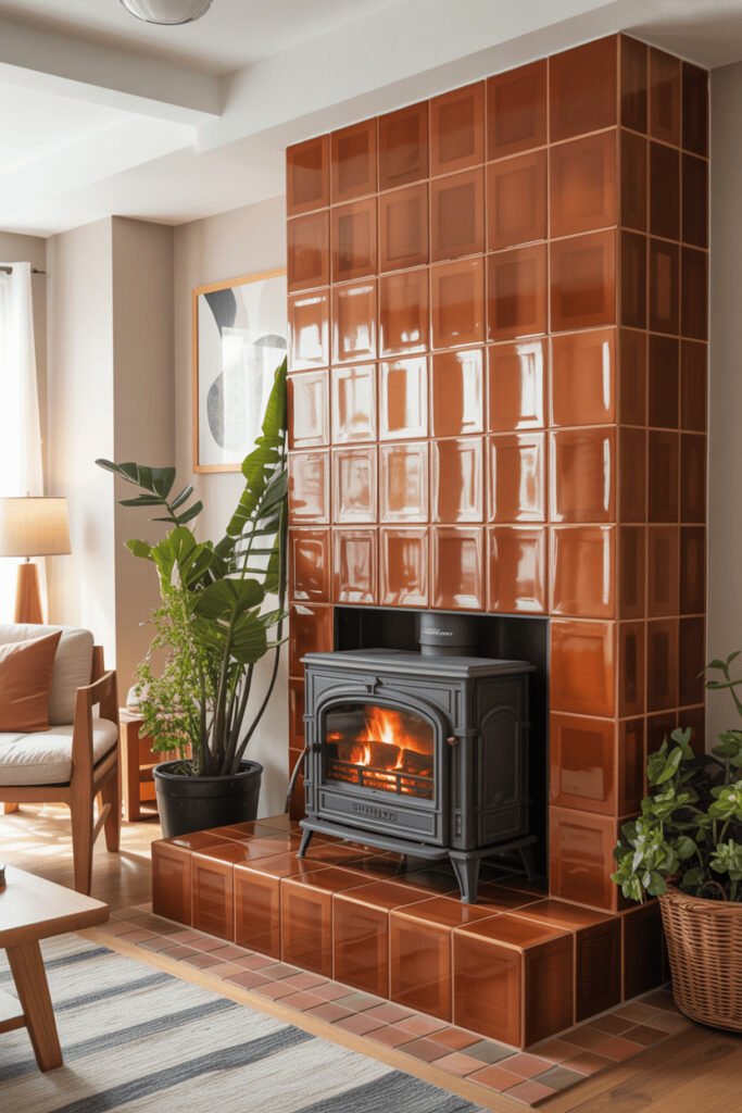 Glazed cinnamon-red tiles bring earthy vibrancy to this environmentally conscious design featuring a wood-burning stove—an increasingly popular eco-friendly choice in 2026. The contrast between rustic heating tradition and polished contemporary tiles creates an inviting aesthetic enhanced by simple greenery and natural wood furniture. This versatile arrangement works equally well in urban apartments and countryside cottages.