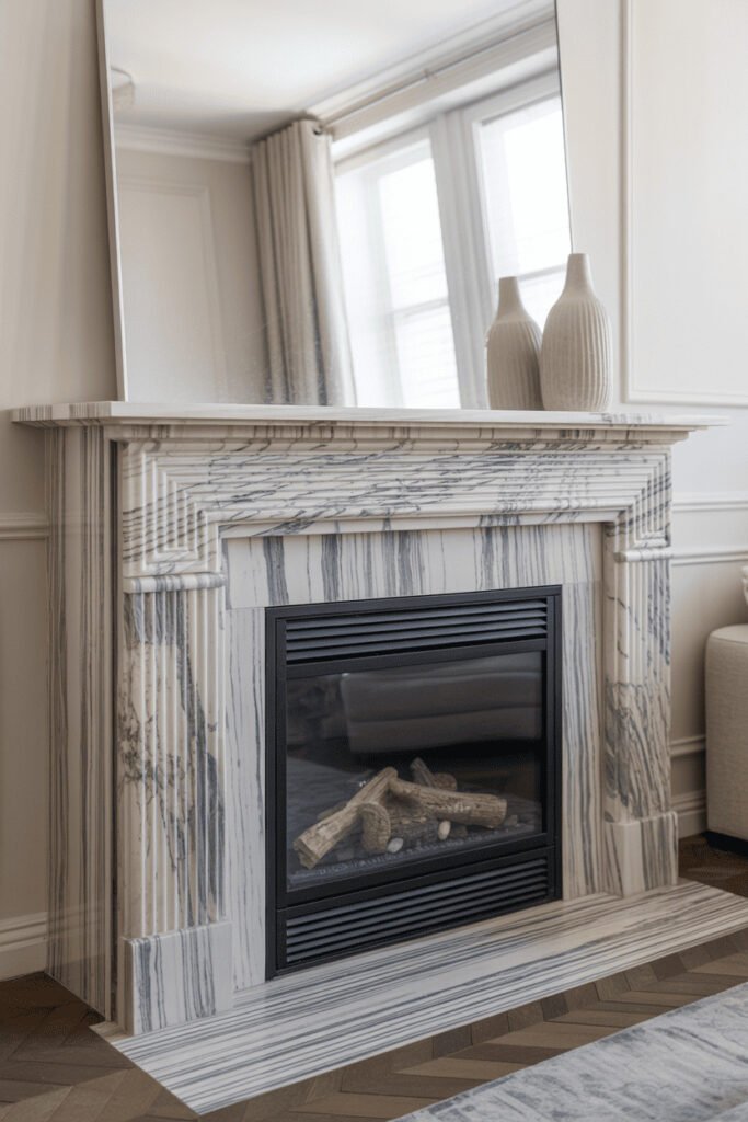 Sophisticated homeowners will appreciate this dramatic striped marble surround where natural veining becomes the design hero. The modern gas insert delivers practical functionality while the fluted mantel creates an intriguing blend of vintage inspiration and contemporary edge. This bold choice demonstrates how marble’s inherent beauty can transform ordinary spaces into extraordinary rooms.