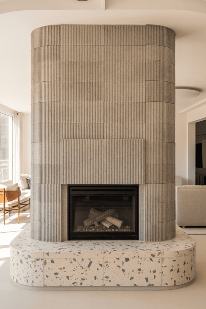 This fireplace immediately captivates with its terrazzo base featuring playful speckled patterns. The tall ribbed surround adds vertical interest while maintaining sculptural simplicity. Terrazzo’s enduring appeal lies in its durability and distinctive character, making this an architectural focal point that balances trendiness with timeless design—a look that will remain stylish well beyond 2026.