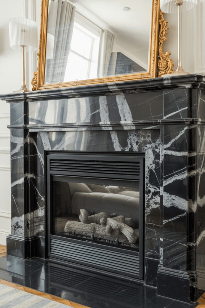 For those seeking dramatic impact, this black marble surround commands attention with its bold veining and polished finish. The gas insert provides convenient, clean operation while gilt accents and an oversized mirror elevate the sophistication. This design transitions seamlessly from modern farmhouse to high-end glamour, proving that fireplaces can serve as striking decorative statements in both urban apartments and spacious suburban homes.