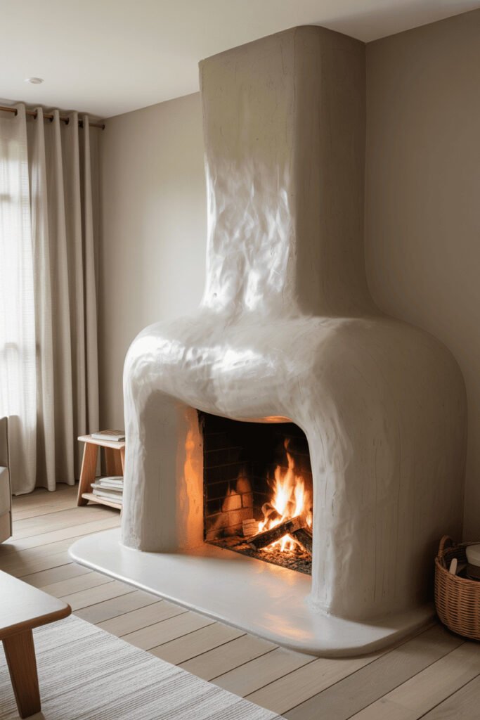 Few designs capture serene luxury quite like this sculptural plaster fireplace. Its soft curves and handcrafted appearance create an almost artistic presence, while the wood-burning fire provides authentic warmth and elemental energy. Natural textures—wood floors, linen drapes, and minimalist accessories—enhance the tranquil atmosphere, making this perfect for cottage retreats or peaceful living rooms where comfort reigns supreme.