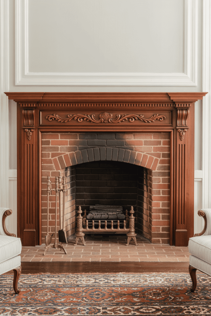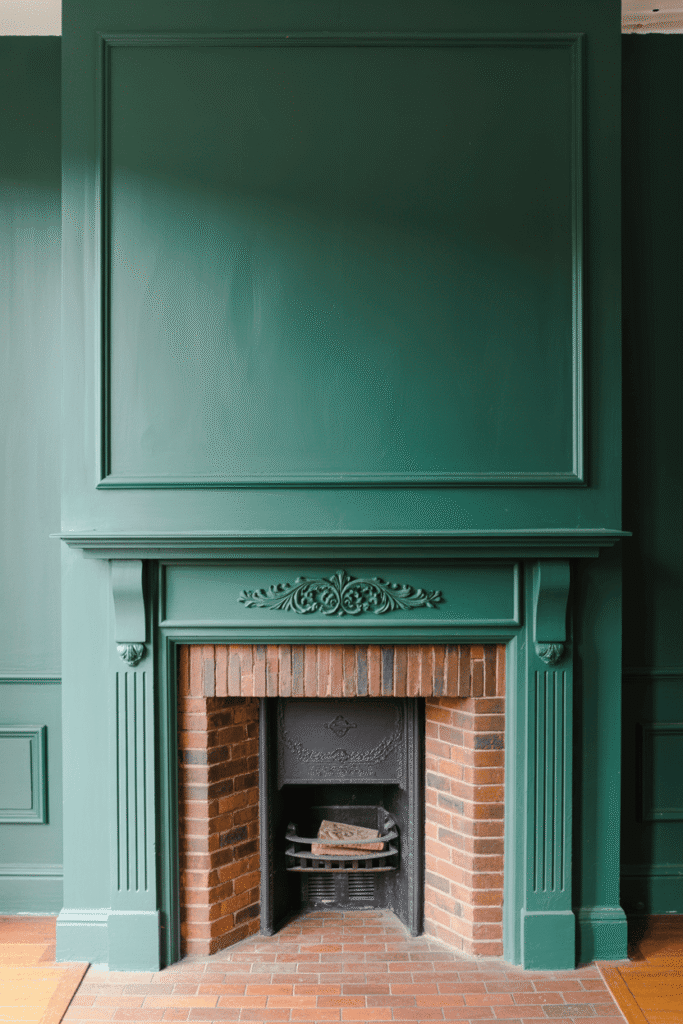 Rich with character, this Victorian-style fireplace showcases intricate carved white molding set against sophisticated dark green walls. The textured brick interior adds depth, while delicate vertical tiles bring the hearth into modern times without sacrificing traditional charm. Perfect for restored townhouses or cottage settings, this design demonstrates how heritage aesthetics can beautifully complement contemporary interiors.