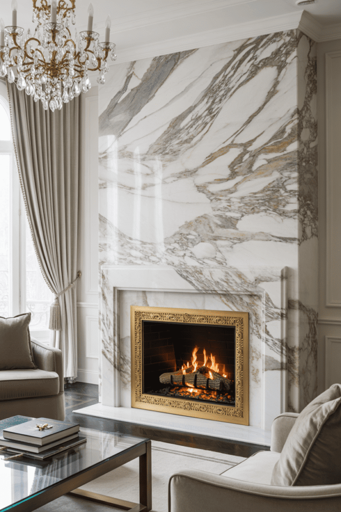 This striking marble fireplace proves modern stone needn’t be rustic. Dramatic veined marble panels combined with built-in shelving and ambient lighting create luxurious sophistication. The seamlessly integrated television nearly disappears into the design rather than dominating it. Gold-toned accessories reinforce the upscale aesthetic, offering hotel-inspired glamour suitable for everyday residential living.