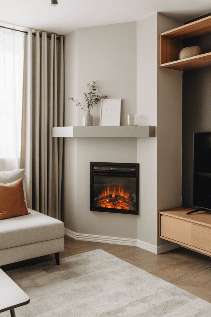 Corner fireplaces work wonders in smaller rooms, creating a cozy nook without sacrificing precious space. They’re perfect for apartments or rooms where space optimization is key.
