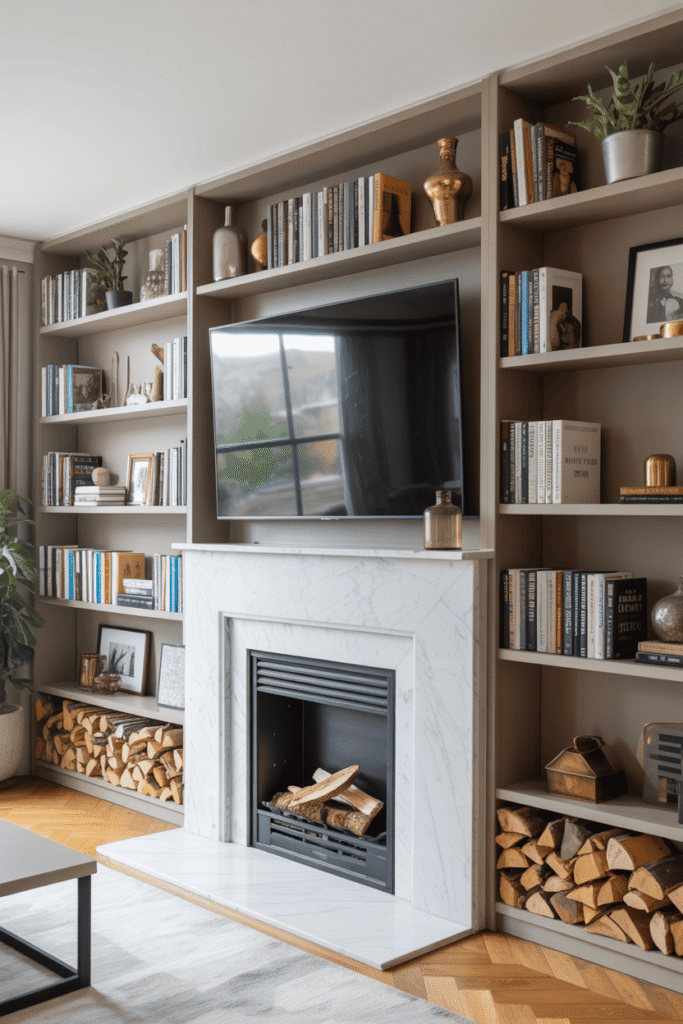 This fireplace masterfully blends modern farmhouse cabinetry with dramatic veined marble, achieving perfect equilibrium between cozy and sophisticated. Natural wood shelving creates a multifunctional entertainment wall with seamlessly integrated television. This design resonates strongly with 2026 homeowners who want living rooms functioning as both entertainment hubs and style statements, balanced by personal accessories and organic greenery.