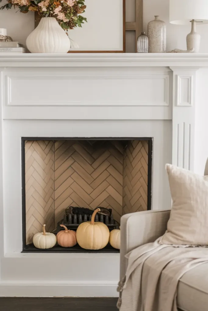 This timeless white-painted surround gains contemporary appeal through herringbone tile detailing within the firebox. Styled with seasonal accents like pale pumpkins and layered textiles, it transitions effortlessly from everyday elegance to holiday celebration. The combination of traditional mantel structure with modern accessories creates year-round versatility—proof that simple styling updates keep fireplaces fresh and inviting.