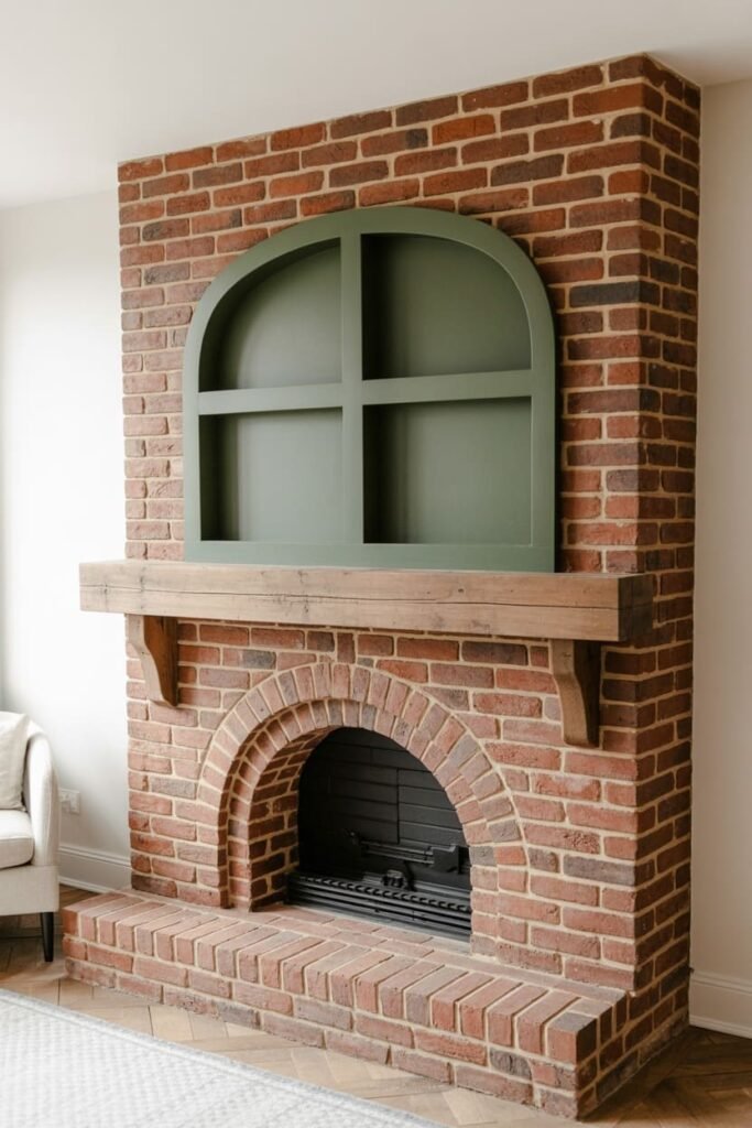 Exposed brick with an arched opening evokes instant nostalgia, while the reclaimed timber mantel speaks directly to farmhouse and cottage design enthusiasts. This aesthetic works beautifully even as a decorative element without active use. The inset shelf painted in earthy green creates a custom-built appearance—a detail increasingly featured in modern farmhouse renovations that honor authentic craftsmanship.