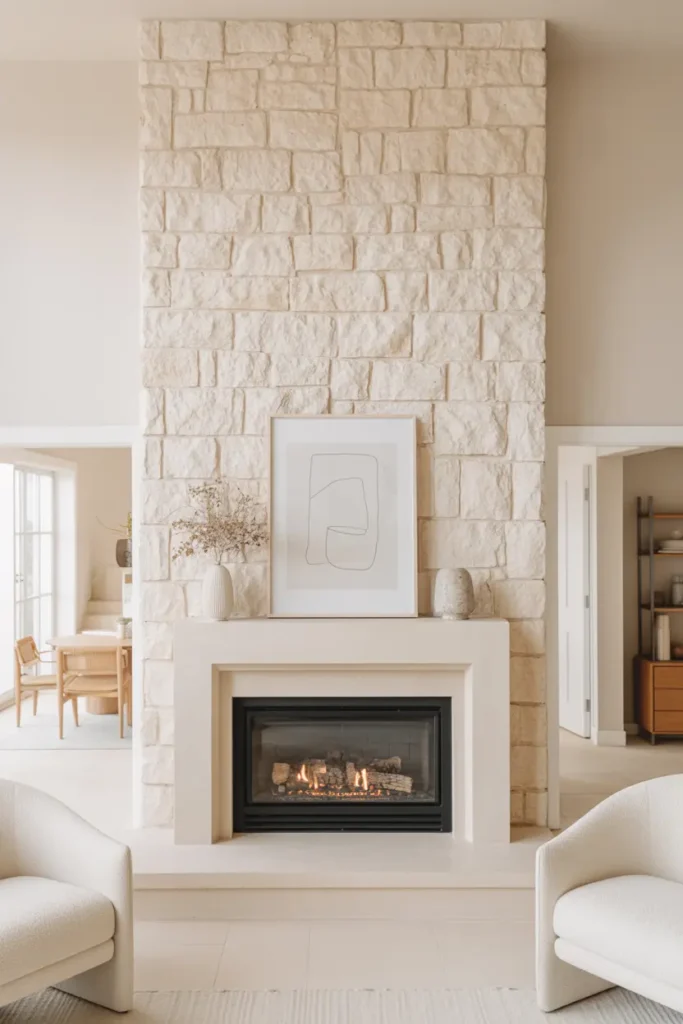 A soaring limestone chimney breast creates breathtaking impact in open-concept spaces. The pale stone maintains an airy, coastal-inspired aesthetic while remaining practical for cooler climates. Rather than mounting a television, this design prioritizes minimalist abstract artwork, allowing the fireplace to remain the room’s undisputed focal point—a testament to 2026’s appreciation for architecture over technology.