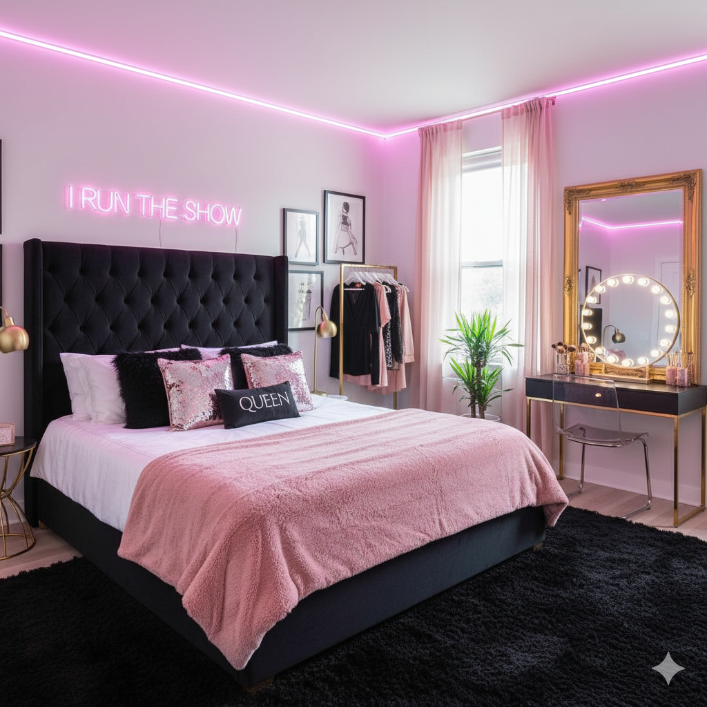 A baddie bedroom reflects confidence and self-love through design. Inspired by social media aesthetics — especially from influencers and lifestyle creators — it’s a blend of chic, modern, and feminine touches. Imagine soft blush tones, bold blacks, cozy textures, and gold accents, all paired with glowing lights and mirror selfies.